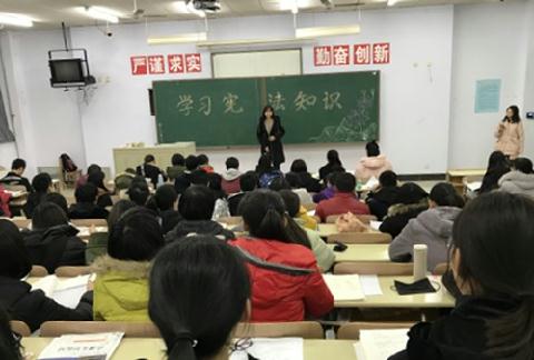 2017年12月1日,基础医学院2017级辅导员老师计艳楠在教学楼教室203召开了关于学习宪法知识的讲座,为各支部主要团干部进行前期培训。12月4日,麻醉学3个团支部于409教室开展了学习宪法知识主题班会,学习了宪法基本知识。12月10日,医学影像学4个团支部在教学楼402教室举办了“领悟十九大,争做好公民”主题教育活动,全体团员学习十九大精神并进行知识竞赛。