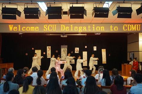 学术交流结束后,护理学院在图书馆八楼多功能厅精心准备了一场具有浓郁中国特色的文艺演出。该活动还得到国际教育学院、校团委、学生各社团的大力支持。我校师生表演了具有中国特色的太极拳、武术、古筝、中华服饰展示、民族舞等,来访的札幌市立大学学生也带来了具有本国特色的歌曲、舞蹈和游戏等。台上台下学生们积极互动,现场气氛热烈、其乐融融。演出结束后来访学生在我校学生指导下体验了中国的书法、武术和舞蹈。会场气氛融洽,双方学生交流热烈。