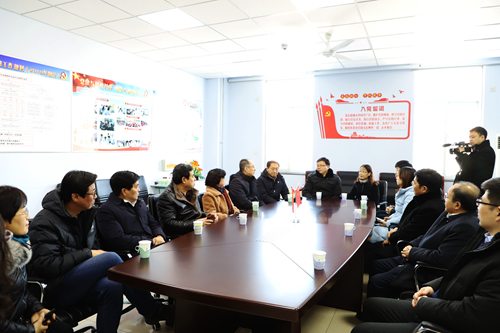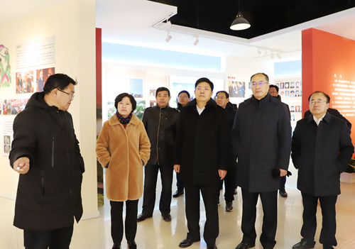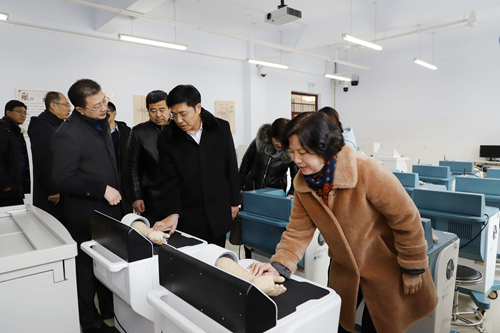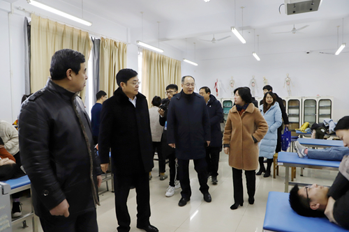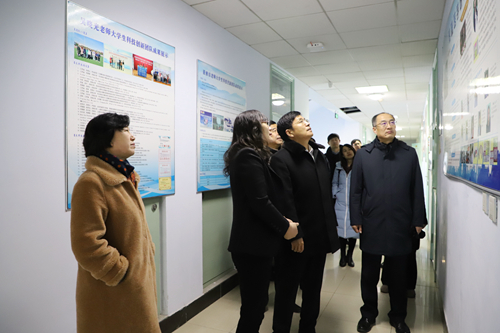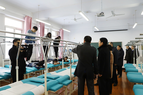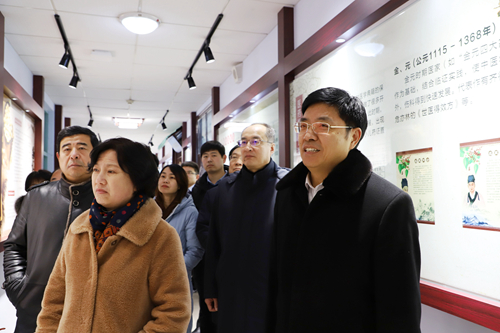 赵丁选一行在我校党委书记盛婉玉、校长唐世英等全体校领导班子成员的陪同下,一同参观了校史馆、中医实验中心、中医文化长廊、基础医学研究所等。在参观校史馆时,赵丁选一行详细了解了我校70余年办学历史和深厚的医学人文底蕴,对学校红医精神及承医精神的继承和发扬表示赞赏。赵丁选一行来到学校中医实验中心,参观了中医文化长廊、中医踩跷实训室、中医推拿实训室、中医诊断实训室、中药标本馆等处。在基础医学研究所,走访了行为学实验室、分子生物学实验室等,听取了负责人关于基础医学研究所的基本情况、工作体系、研究平台、师资队伍、科研成果以及社会服务和基础医学研究所基本概况、科研平台建设、人才培养和科学研究等内容的介绍。