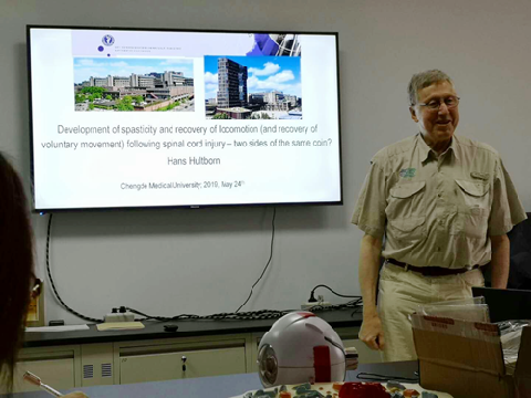 5月24日上午,Hans Hultborn院士在科研楼322为老师和研究生进行学术讲座,题目《Development of spasticity and recovery of locomotion following spinal cord injury-two sides of the same coin?》。专家的讲座不仅为师生开阔了视野,对提高学校科研水平也起到了良好的推动作用;任立群教师汇报了脊髓损伤与修复研究室的工作进展和规划,脊髓研究团队成员进行了课题进展汇报,两位专家对研究室工作给予肯定并给出建设性意见。入工作站期间,Hans Hultborn院士还为教师和研究生进行科研答疑和辅导。