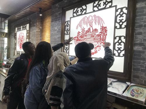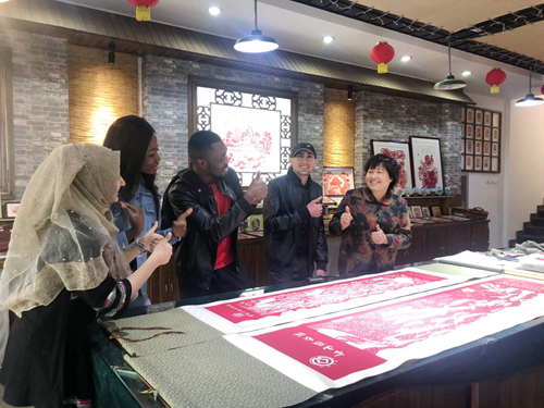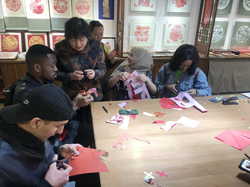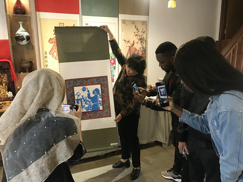 剪纸艺术传承人石俊凤大师为留学生展示作品