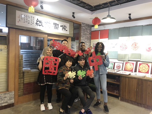 参观结束后,留学生们亲自动手体验剪纸,在馆内剪纸大师们的悉心指导下创作属于自己的剪纸作品。留学生们边动手边讨论,气氛愉悦。经过大师们最后的协助调整完成了各自手中的作品:“蝴蝶”“牛”以及文字“中”和“国”。各个剪纸作品拼接在一起与国庆佳节相呼应,寓意着“飞翔的中国,牛!”。在一旁的电台记者将这些精彩瞬间抓拍记录。