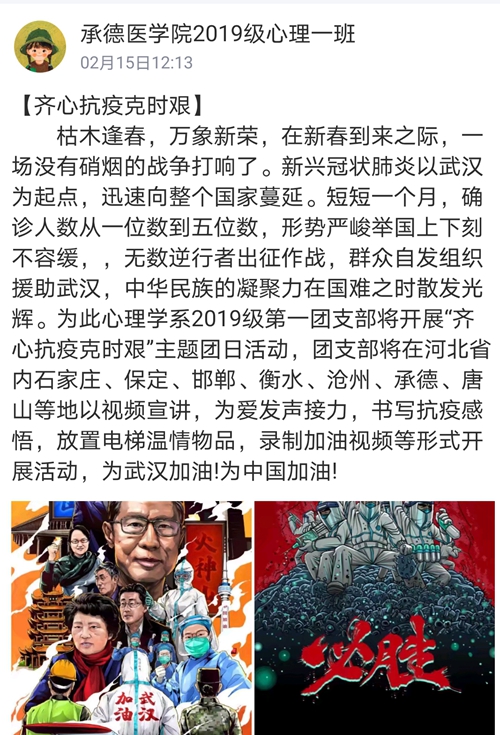 习近平总书记在疫情防控中作出“坚定信心,同舟共济,科学防治,精准施策”的明确指令,为深入贯彻落实习近平总书记的一系列重要指示精神,为疫情防控做贡献,心理学系2019级第一团支部充分发挥“党有号召,团有行动”的优良传统,于2月中旬在河北省各地组织开展“齐心抗疫克时艰”主题团日活动。