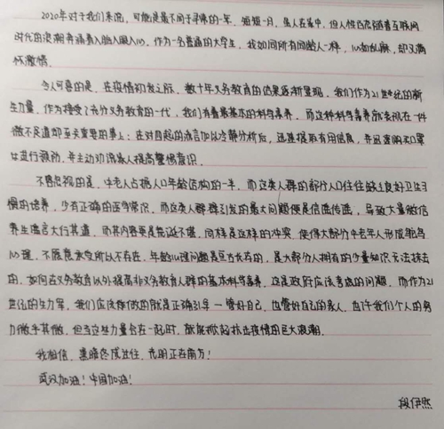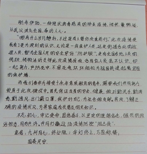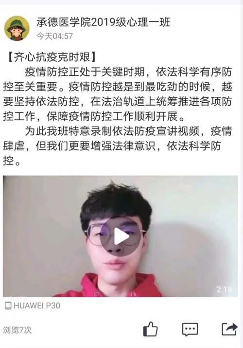 团支部全体团员因高度的责任感和使命感而紧紧凝聚在一起,积极开展了线上团日活动。充分发挥互联网优势,通过视频录制的方式向身边人宣传疫情相关法律知识;团支部成员参与全民k歌助力武汉歌声接力活动,为爱发声,并书写自身对国家及社会各界在疫情期间的一系列行动的感悟,抒发家国情怀;部分团员自愿报名加入社区、村庄志愿者队伍,并通过在电梯中放置纸抽等行为,以自身力量带动身边人,为疫情做出贡献。通过团支部官方QQ播放本班同学及其亲朋好友为武汉加油助力的视频,为奋斗在一线的“最美逆行者”们加油鼓劲。