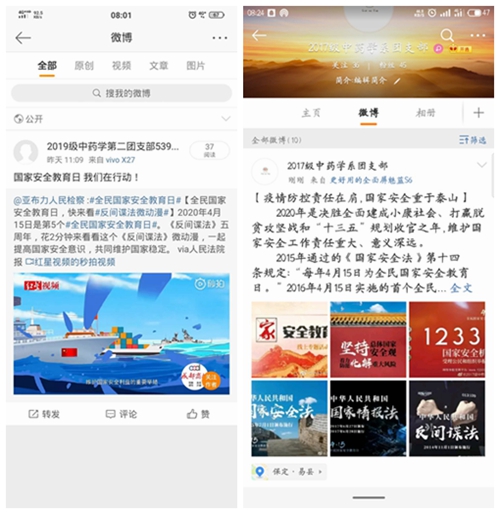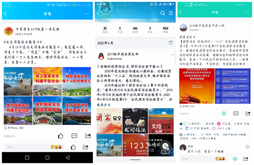利用新媒体平台,广泛开展宣传。各团支部通过官方微博、QQ等新媒体平台转发2020年全民国家安全日主题、学习图片、法律知识、宣传视频等资料,并同步在班级QQ群内推送学习内容,营造起浓厚的宣传教育氛围,动员全体同学积极参与,为系列活动的开展做好预热铺垫。