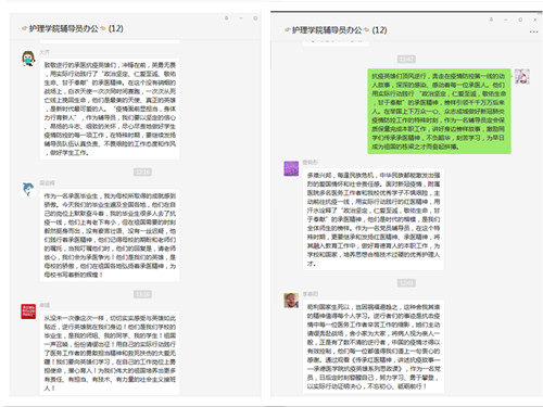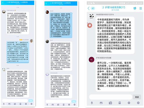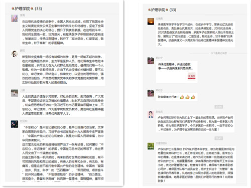 师生们在观看后纷纷留言:承医师生不惧艰险、主动前往抗疫一线,没有豪言壮语、没有一丝迟疑,他们记得母校的期盼和嘱托;他们践行着承医精神、传承着红医精神;他们是时代的楷模,是全体师生的榜样。在全国抗疫取得阶段性胜利的今天,护理系全体师生也必将以榜样为引领亮出本色、坚守底色、扮好角色,在新时代建功立业,续写承医新的辉煌。