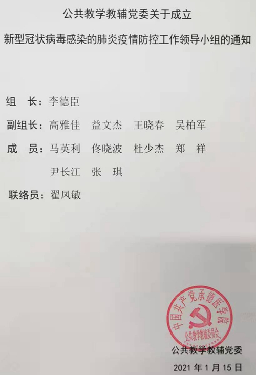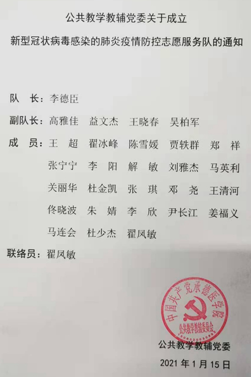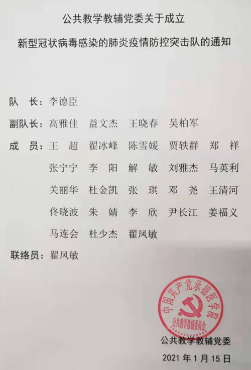同时将公共教学教辅党委抗击疫情工作领导小组成员调整为党委书记任组长、党委委员任副组长、各支部书记为成员、专职组织员为联络员。并结合当前疫情形势,及时成立了公共教学教辅党委疫情防控突击队和志愿服务队。