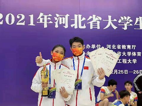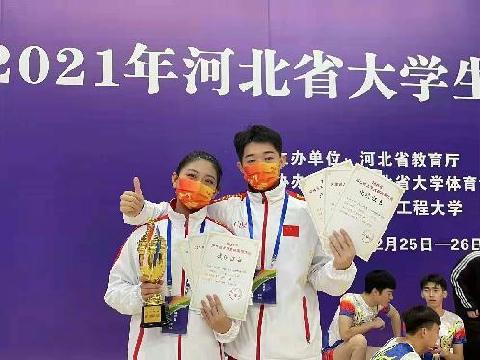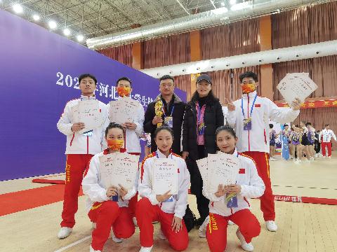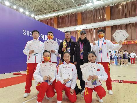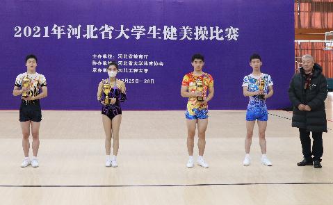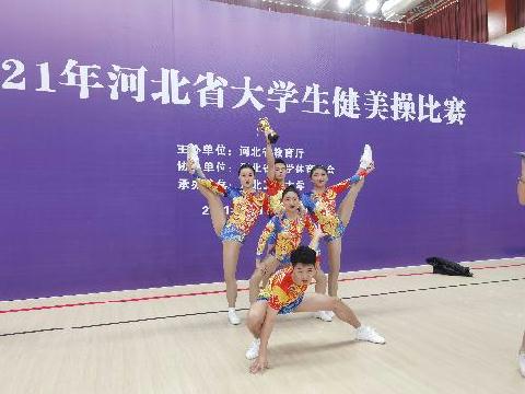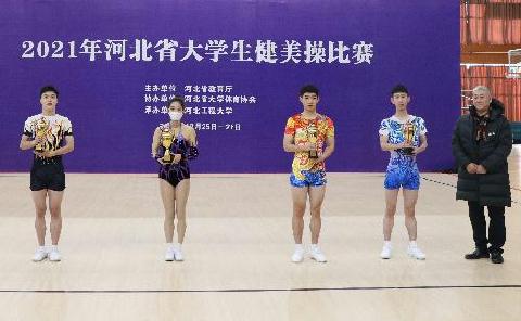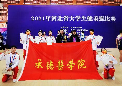 12月25日—26日,河北省教育厅于河北工程大学举行2021年河北省大学生健美操比赛。经过两天的激烈角逐,承德医学院代表队在普通本科院校甲组比赛的五个项目中,荣获混合双人操比赛第二名(郭经纬,付安妮两位同学参赛);五人操比赛第二名(郭经纬、付安妮、常昊、刘伊博、张凤怡参赛);三人操比赛第五名(唐磊、刘伊博、常昊参赛);女单(付安妮)比赛第六名;男单(郭经纬)比赛第七名的优异成绩。郭长利教练获得“优秀教练员”荣誉称号,唐磊同学获得“优秀运动员”荣誉称号,健美操代表队获得教育厅颁发的“体育道德风尚奖”奖杯。运动健儿们在比赛中表现出胜不骄、败不馁,奋勇争先、顽强拼搏的体育精神,受到大会的称赞和表扬,为学校争得了荣誉。