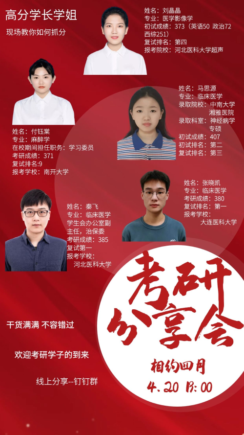 为了让2018级见习学生在实习前深入了解硕士研究生考试的详情,明确考研目标,掌握考研技巧,承德医学院附属医院教育处于2022年4月20日晚7时采用线上直播的方式举办了一场考研复试经验交流会,本次交流会历时2小时,吸引了来自2018级临床医学专业、医学影像专业、麻醉学专业的174名同学参加。本次线上考研复试经验交流会采用“钉钉”APP进行直播,由2018级麻醉学专业李家琛同学主持,特别邀请了2017级麻醉学专业付钰棠、医学影像学专业刘晶晶、临床医学专业秦飞、马思源、张晓凯等五位考研成绩优秀的同学,在线为同学们分享考研经验。他们从复习计划、课程选择、笔试、复试、调剂等多方面为大家介绍,用自己的切身经历,深入详实、毫无保留地讲解,提醒同学们要注重专业知识的复习,复习阶段则要放平心态、从容应考。