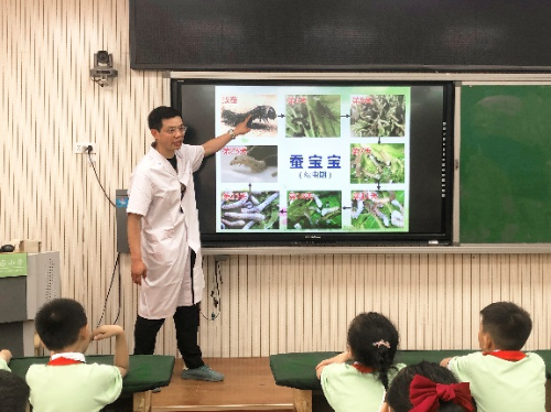 本次活动包含知识宣讲和实践指导两部分。志愿服务队黄露老师以《遇见蚕宝宝》为题,以故事、图片、数据等形式给同学们讲述了家蚕的结构和生命历程,介绍了家庭养蚕窍门和传统养蚕概况,展示了天然彩色蚕茧及其工艺品,并就我国蚕桑丝绸历史与文化、传统缫丝与织绸工艺、现代蚕桑科技成果等进行系统的解说,幽默生动的宣讲使孩子们对蚕桑科技与文化产生了浓厚的兴趣。实践指导环节服务队老师展示了家蚕、桑叶和丝绸展品实物,让每名同学认领蚕宝宝,解答了同学们提出的许多问题,大量精准有力的蚕桑科技数据让他们产生了极大的兴趣。