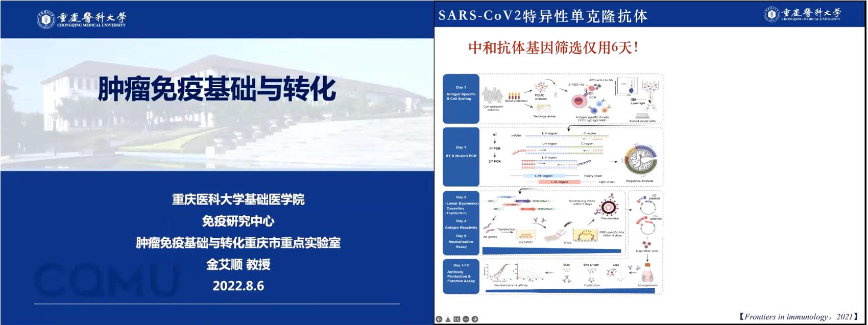 金艾顺以“肿瘤免疫基础与转化研究”为主题进行了精彩讲座,并结合自身十多年来在肿瘤免疫治疗基础与转化研究,由浅入深地介绍目前主流肿瘤免疫治疗免疫学原理、肿瘤免疫治疗研究进展,主要包括全人源抗体技术研发、抗体药物研发和转化以及TCR-T细胞免疫治疗及其相关抗肿瘤机制研究。与广大师生分享了在新冠疫情暴发时,带领科研团队在短时间内攻克重重技术瓶颈,建立了高效快速筛选中和抗体技术平台,筛选得到多株新冠病毒及突变株的高效中和抗体的相关研究成果。最后,对肿瘤免疫治疗存在问题和未来发展趋势进行展望。讲座后,金艾顺就与会师生提出的问题进行了细致的解答,开拓了与会师生的科研视野,为大家提供了新的研究方向和研究思路。