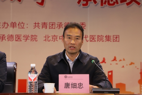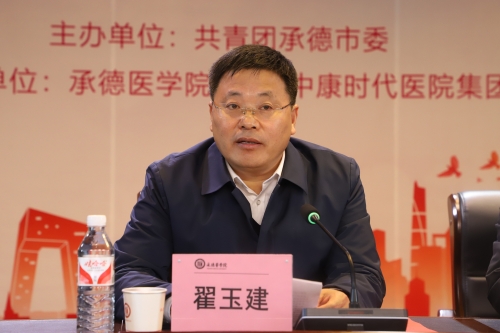 仪式最后,翟玉建讲话,对支持我校教育事业发展、关心学生成长成才的共青团承德市委和北京中康时代医院投资集团表达感谢。他指出,我校自建校以来始终扎根塞外、服务社会,培养医疗卫生领域专业人才。未来我校会继续秉承承医精神,牢记立德树人的根本任务,全心全意为学生成长成才服务,也希望同学们珍惜荣誉,再接再厉,充分发挥模范带头作用,在医学道路上扎实学识、锤炼品德、勇攀高峰,为全面建设社会主义现代化国家贡献青春力量。