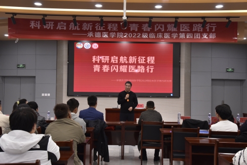 为提高承医学子对科技创新和科研诚信的重视,开启承医学子“从理论到实践”的科研之路,在基础医学院党委和基础医学院2022级学生党支部的指导下,基础医学院2022级临床医学第四团支部于2023年11月19日上午在承德医学院大学生活动中心214会议室召开以“科研启航新征程,青春闪耀医路行”为主题的团日活动。本次主题团日活动特邀承德市科技局社发科科长孙洪亮、承德市中心医院科教处科长苏彬作讲座。学生处副处长于海龙、病原生物实验中心教授刘金霞老师、病理教研室教师苏莹老师、基础医学院2022级第一年级办辅导员老师及基础医学院2022级临床医学第四、七团支部全体成员参加本次活动。