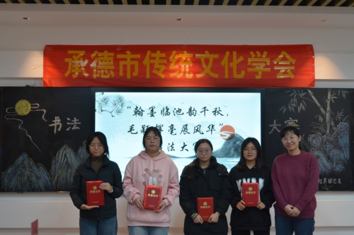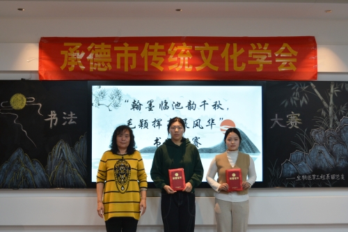 河北省书法家协会会员、承德市书法家协会女子分会主席李颜君为获一等奖选手颁奖