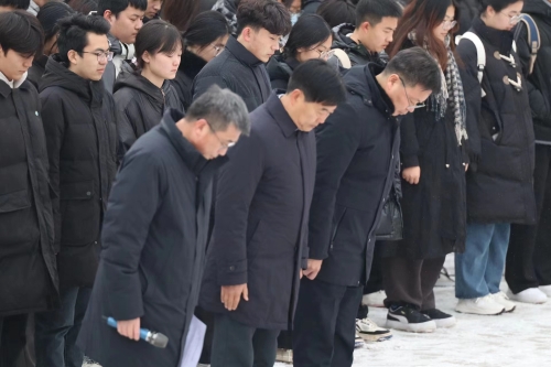 学校仪仗队队员将五星红旗缓缓降至旗杆半高,全场人员神情肃穆,行注目礼。随后,全体人员摘帽默哀一分钟,表达对南京大屠杀死难者的深切哀悼,共同缅怀为争取民族独立和人民解放而英勇献身的革命先烈。