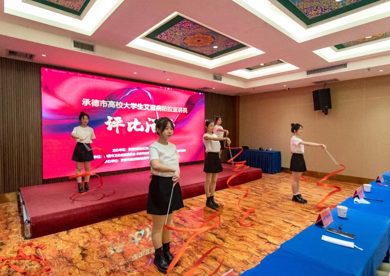 此次活动首先由承德市疾控中心艾滋病防治科科长高杰汇报我市艾滋病疫情及近年来我市大学生艾滋病防治工作。在活动中,我校宣讲团成员以积极热情的态度,通过宣讲的方式科普了艾滋病相关知识,展现了青年学生参与艾滋病防控的热情。我校学生一句句感人肺腑的语言,一条条真诚的建议,感染了现场的评委,也感染了现场的观众。全部作品展示完毕后,我校大学生红丝带协会文艺部为大家带来了精彩的丝带舞表演,将同学们对艾滋病群体的关心以舞蹈形式展现出来。经过评委老师评选,最终我校宣讲队伍分别荣获了银奖、铜奖和优秀奖。