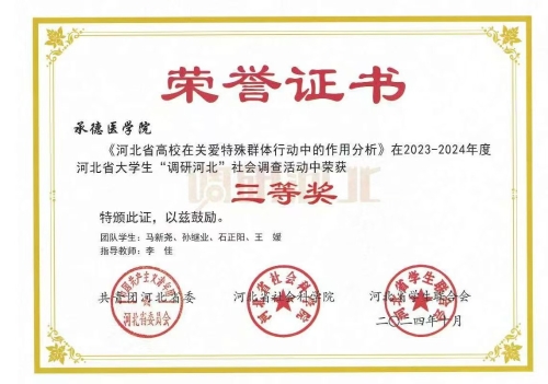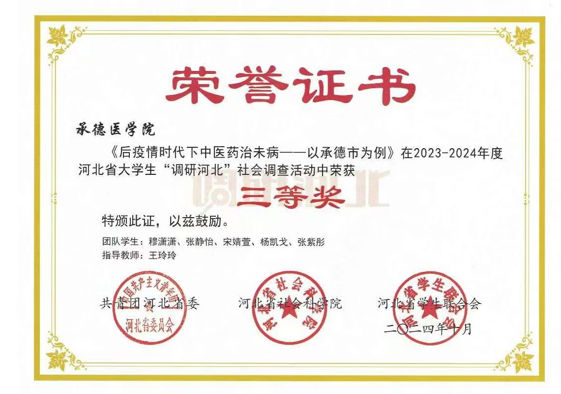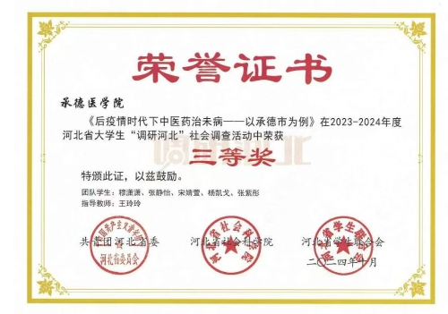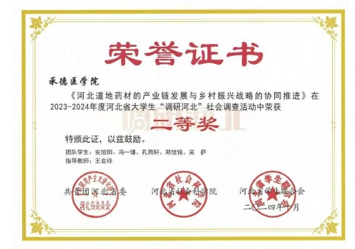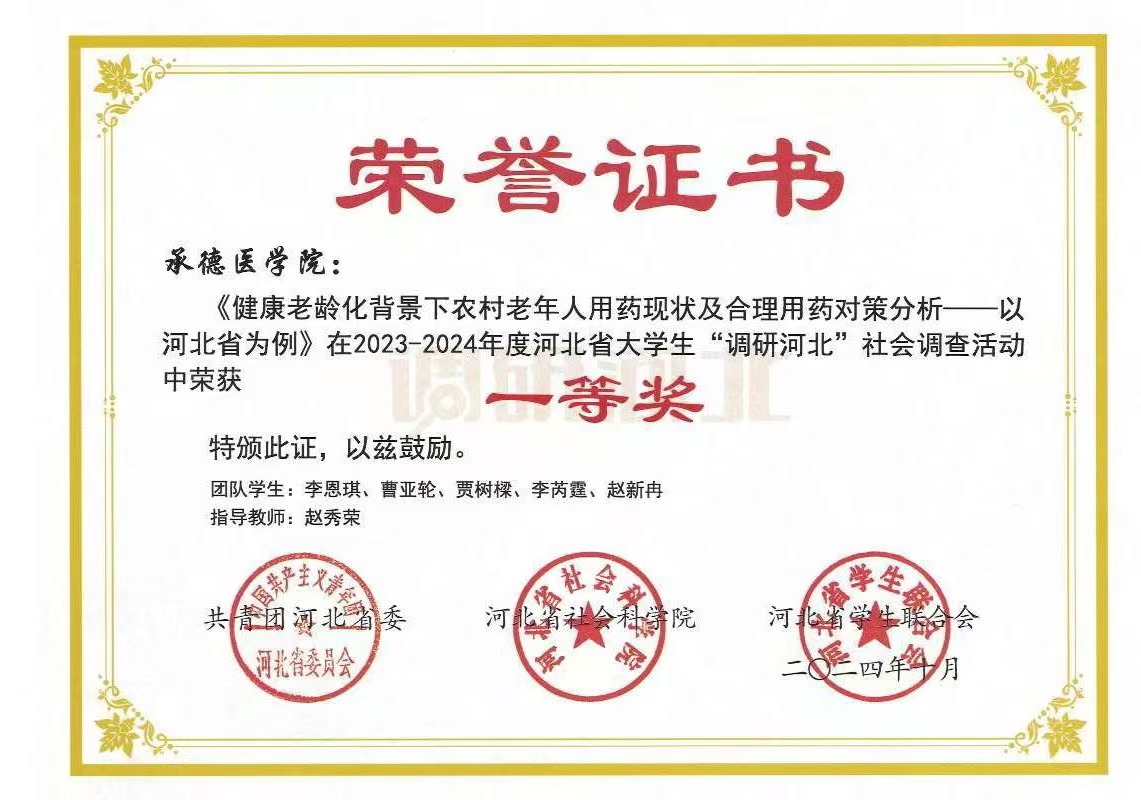 作品《健康老龄化背景下农村老年人用药现状及合理用药对策分析——以河北省为例》荣获一等奖,《河北道地药材的产业链发展与乡村振兴战略的协同推进》荣获二等奖,《河北省高校在关爱特殊群体行动中的作用分析》《后疫情时代下中医药治未病——以承德市为例》荣获三等奖。