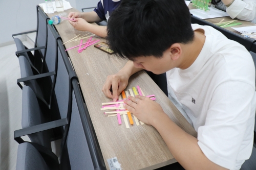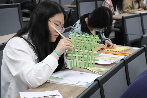 主讲人王泽旭向同学们详细介绍了竹编的历史渊源和文化背景以及竹编艺术品的种类和制作技巧。随后同学们用竹篾练习如何制作竹编作品。同学们将传统的编织技法与自己的设计理念进行了组合创新,在一经一纬纵横间赋予竹编更为多样的表现形式。最后,每个小组展示自己的竹编作品,分享参与过程中的经验技巧,讲述制作竹编作品中所体悟到的劳动价值和对生活的热爱。