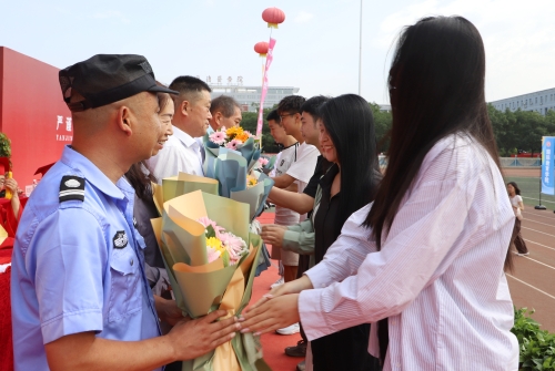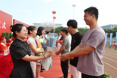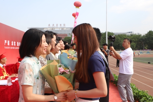 毕业生代表向保安员、宿管员、餐饮服务人员、后勤服务保障人员等教职员工代表献花