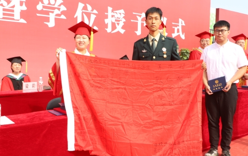 退伍大学生毕业生代表将2024届全体退伍大学生签名的旗帜献给母校以表感谢