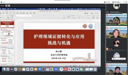 2024年6月29日,护理系邀请北京大学护理学院院长尚少梅以腾讯视频会议形式开展题为“护理领域证据转化与应用挑战与机遇”的学术讲座。护理系主任田建丽、全体专兼职教师、研究生导师和研究生参加此次讲座。护理系副主任郑纪宁主持本次会议。