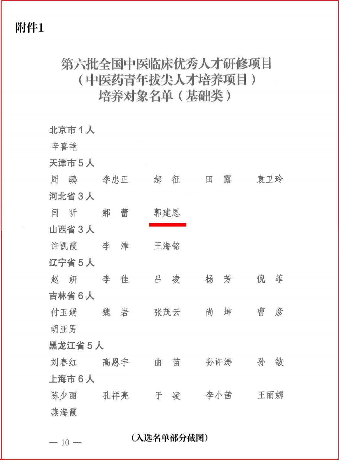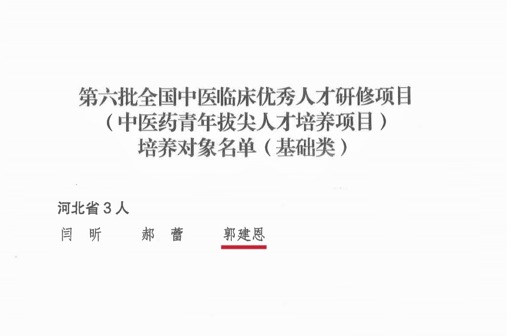 近日,国家中医药管理局公布了第六批全国中医临床优秀人才研修项目(中医药青年拔尖人才培养项目)培养对象名单,经过严格选拔,我校中医系郭建恩副教授凭借扎实的理论功底、丰富的临床经验和突出的业务能力成功入选。全国共有100人入选该项目(基础类),河北省仅3人获此殊荣。