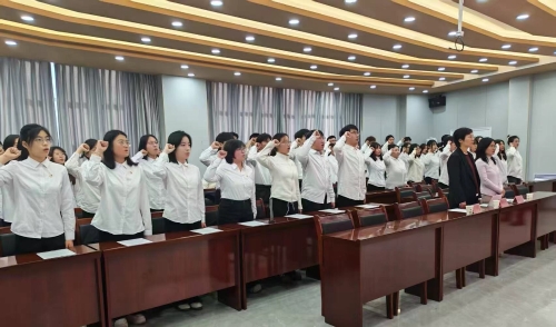 仪式在庄严的国歌声中开始,张靖宜宣读新团员名单,50名同学正式加入中国共产主义青年团。李庆林与徐晓芳为新团员代表佩戴团徽,勉励他们铭记身份、担当责任。