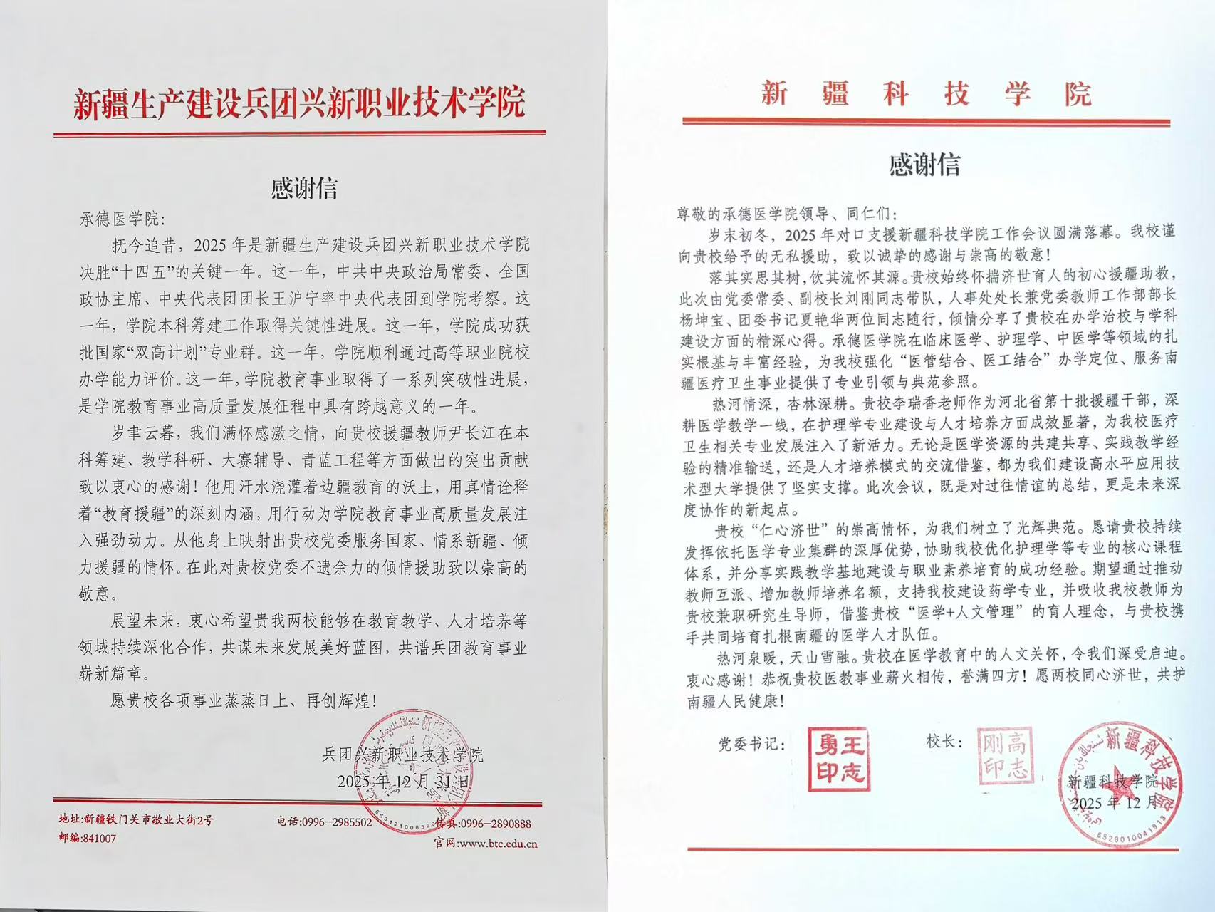 近日,承德医学院先后收到来自新疆生产建设兵团兴新职业技术学院和新疆科技学院的感谢信。信中字里行间洋溢着真挚的情谊,两校分别对我校援疆教师尹长江、李瑞香在援疆期间作出的突出贡献给予了高度评价,充分肯定了我校在教育援疆工作中所展现出的社会责任与使命担当。