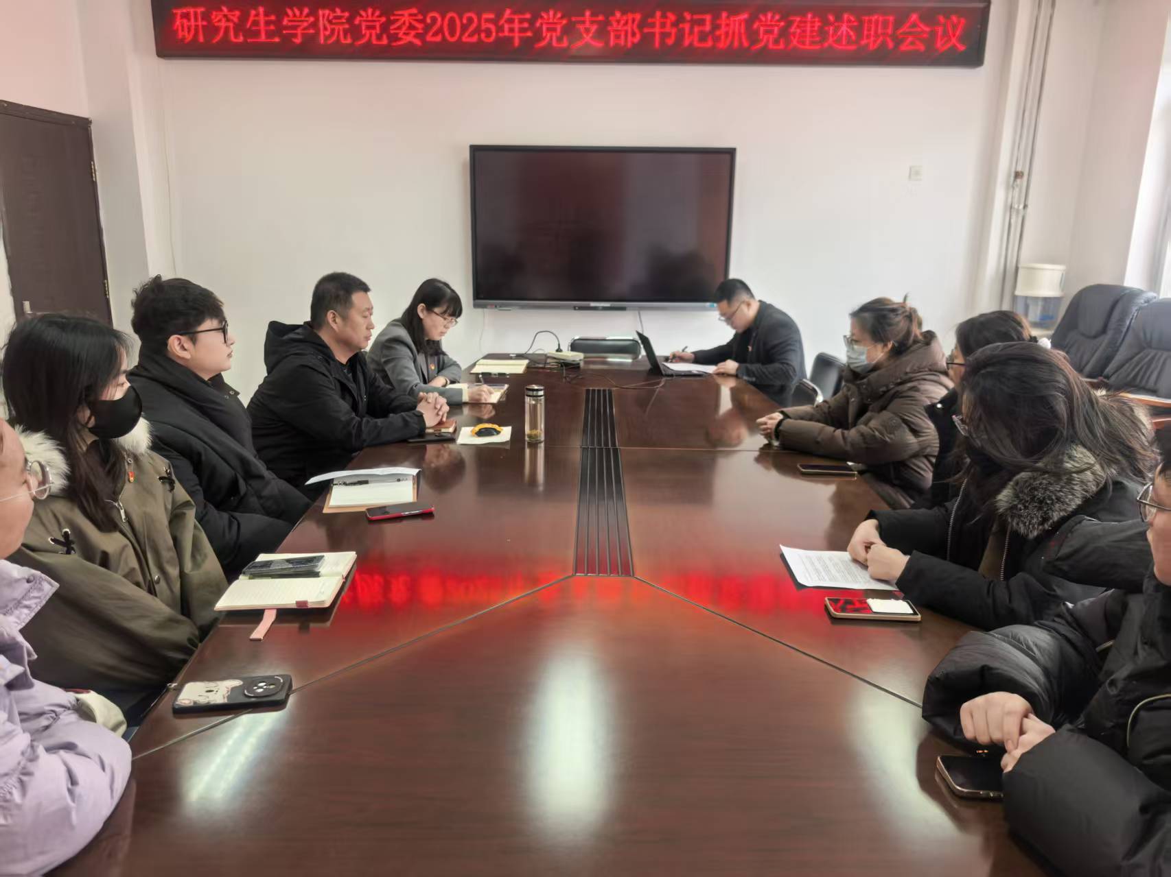 为落实新时代党的建设总要求和新时代党的组织路线,督促各党支部书记认真履行第一责任人职责,切实提升基层党建工作水平,按照学校党委工作要求,2026年1月9日上午,研究生学院党委在行政楼101会议室召开了2025年党支部书记抓党建述职会议,会议采取线上线下相结合的方式进行。研究生学院党委成员以及全体学生党支部书记和委员参加会议。会议由研究生学院党委书记苗光新主持。