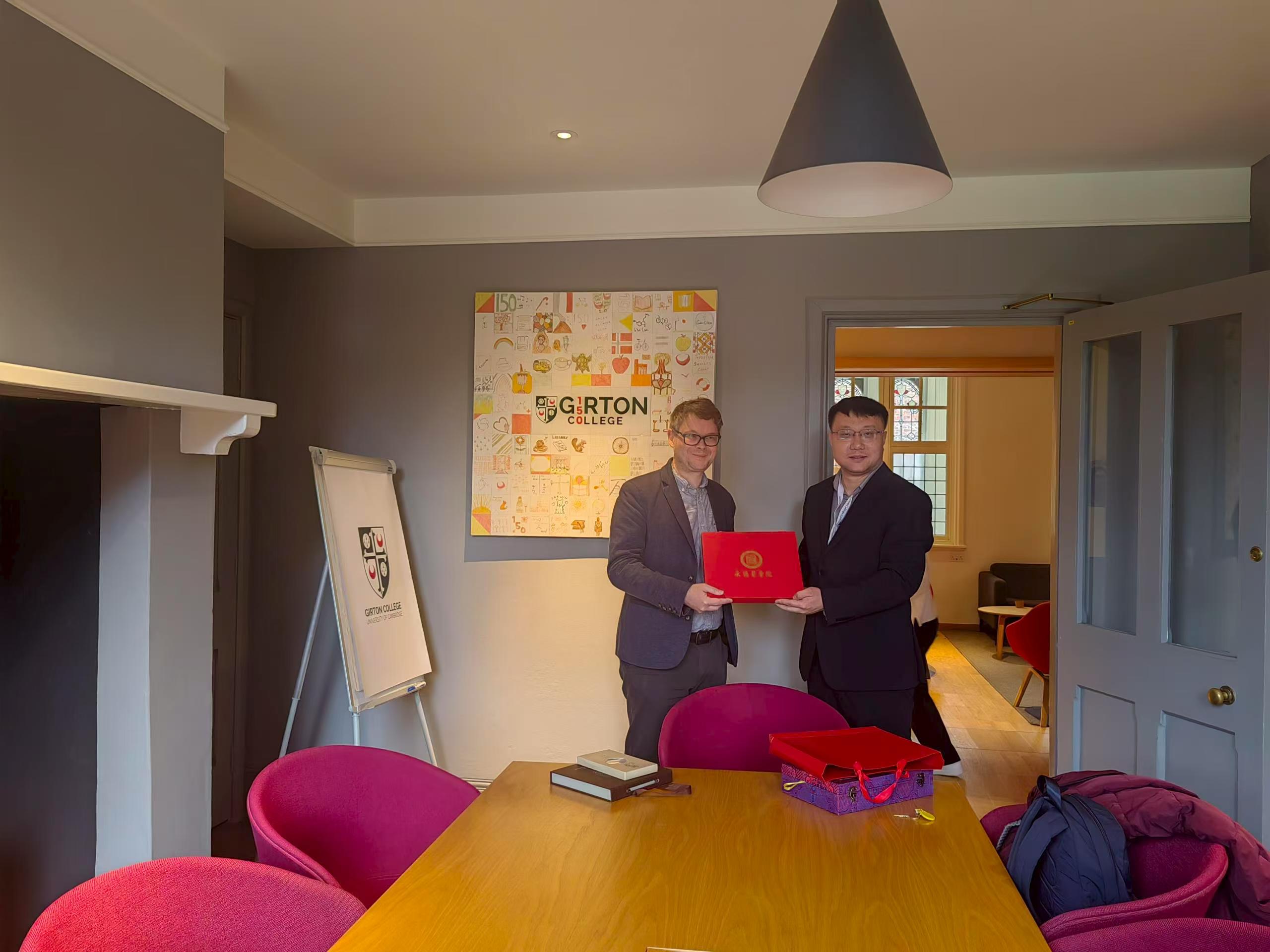 研学期间,带队教师丁实代表学校与剑桥大学全球项目部主任Nick Godfrey博士及项目授课团队进行了深入会谈,双方就本次学生的学习情况、未来课程优化方向以及进一步开展师生互访、学术合作等事宜交换了意见,为未来两校建立长效合作机制打下了良好基础。会谈后丁实向剑桥大学教授赠送礼品。